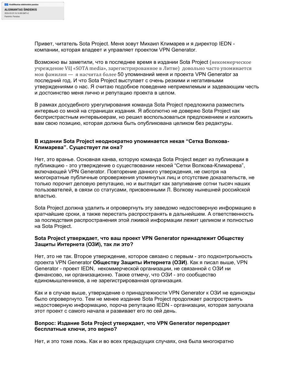 Некоторое время назад Михаил Климарев прислал досудебную претензию нашему изданию, посвященную нашему же расследованию о сетке торговли VPN. Отвечая на претензию, мы предложили взять у него интервью, на что он в несколько странной форме согласился, прислав нам текст, обращенный к читателям нашего издания.