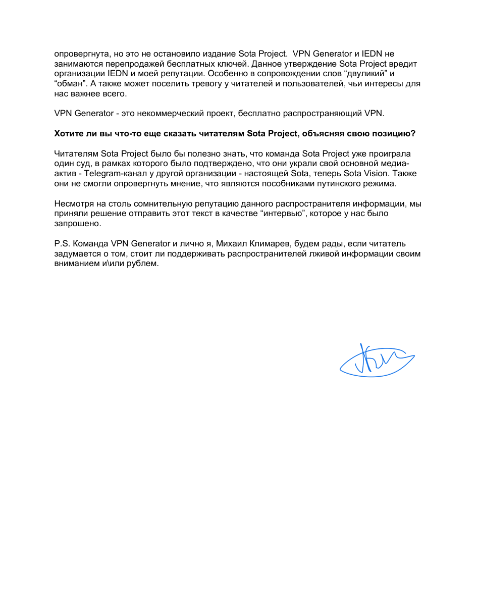 В-третьих, мы не считаем Михаила своим «противником». Созданный им «VPN Генератор» – в целом, полезный и нужный проект, поскольку позволяет пробивать опускающийся над Россией железный занавес. Все наши публикации были направлены лишь на установление правды и ничего, кроме правды, и единственное, что беспокоит наше издание, – это качество и безопасность предоставляемых проектом Михаила услуг и прозрачность их условий. Мы убеждены, что, если он возлагает на себя указанную выше задачу по борьбе с железным занавесом, то не меньше нас заинтересован в обеспечении максимальной безопасности тех людей, которые ему доверились. Этот вопрос единственный, который в контексте нашего спора имеет значение, и это единственная причина, по которой мы уделяем внимание его, бесспорно, общественно важной работе.