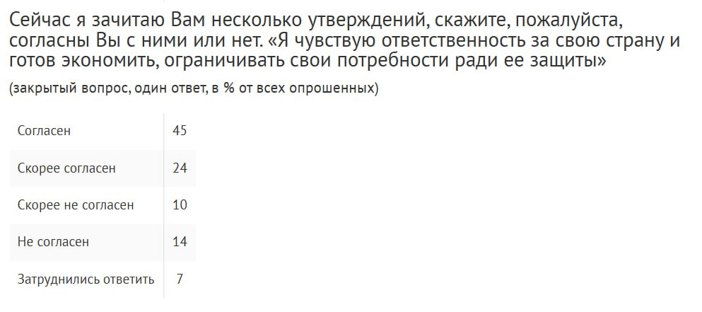 Согласно этим данным, 80% россиян испытывают доверие и гордость за свою армию, а 69% заявили, что чувствуют ответственность за страну и готовы экономить и ограничивать свои потребности во имя ее защиты.