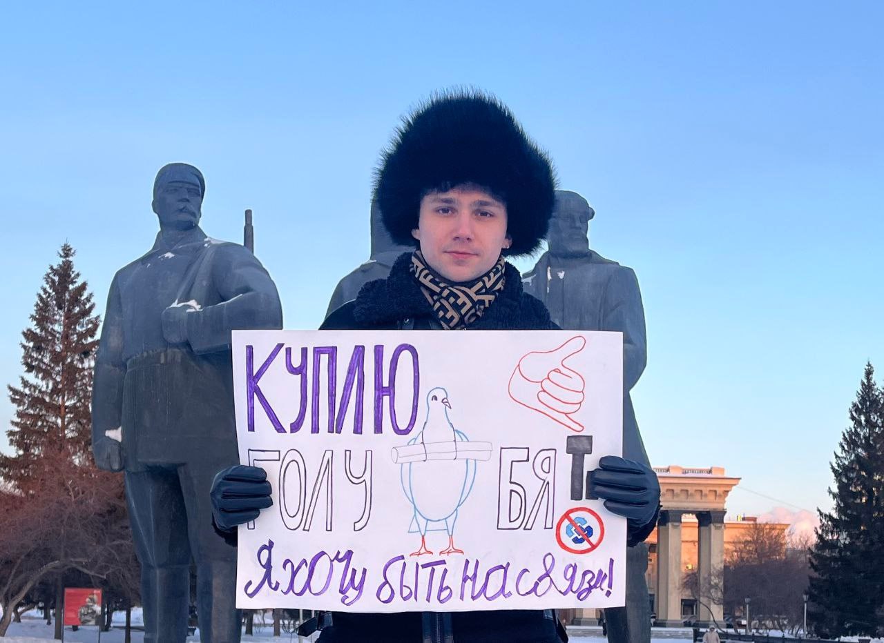 После этого молодой человек опубликовал фотографию своего пикета на Театральной площади, у памятника Ленину. На ней он держит плакат со словами «Куплю голубя. Я хочу быть на связи» и перечеркнутой эмблемой Роскомнадзора.