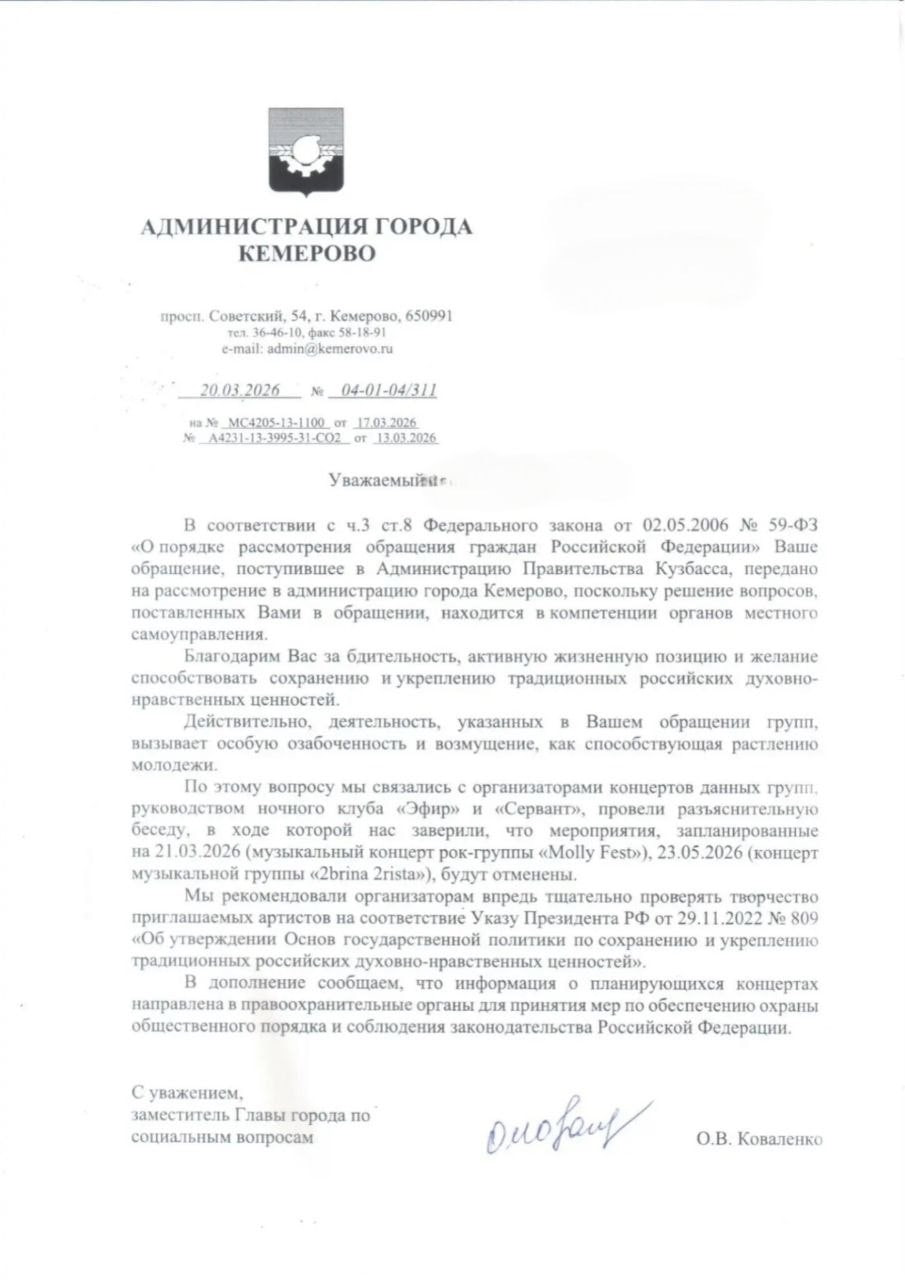 «Кибердружина Русской общины» получила ответ от администрации Кемерово, в которой заверили, что площадки, проводящие мероприятия, от своих планов отказались. Об этом сообщается в группе региональной ячейки движения.