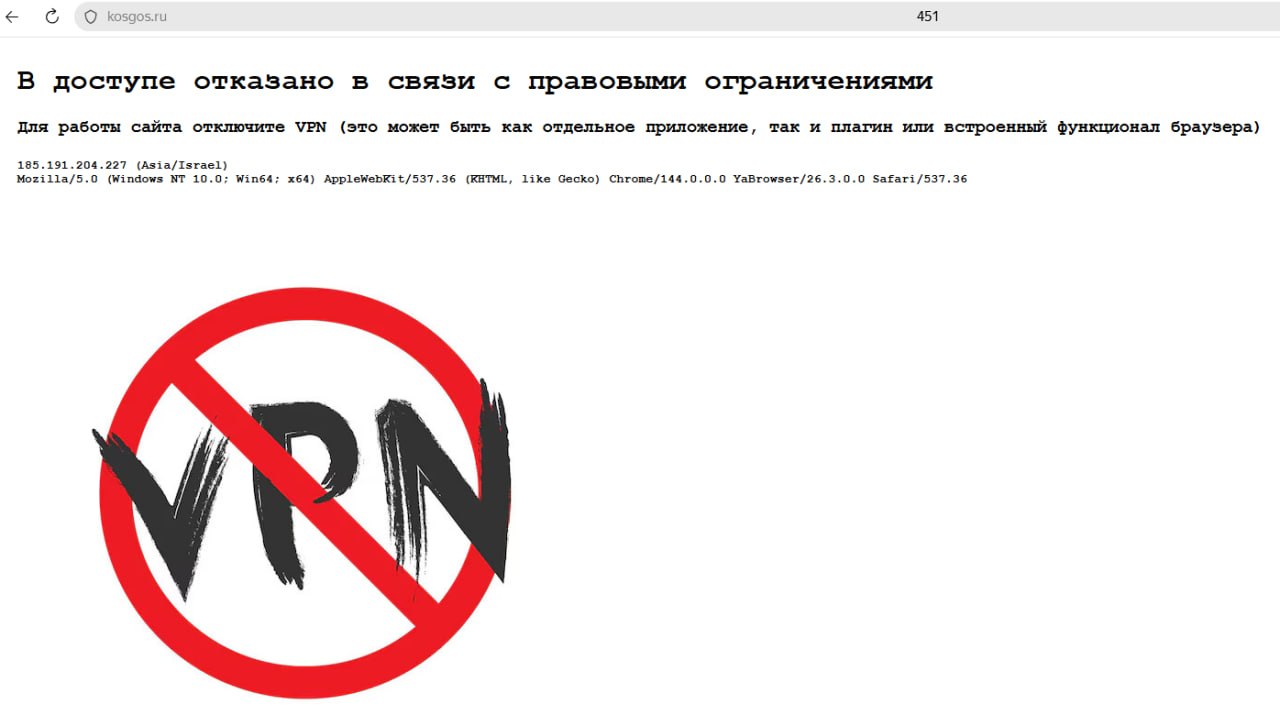 Вместо запрета просмотра своего сайта с VPN вуз просто закрыл просмотры из большинства зарубежных стран. В этом случае появляется сообщение «В доступе отказано в связи с правовыми ограничениями» (см. скриншот).