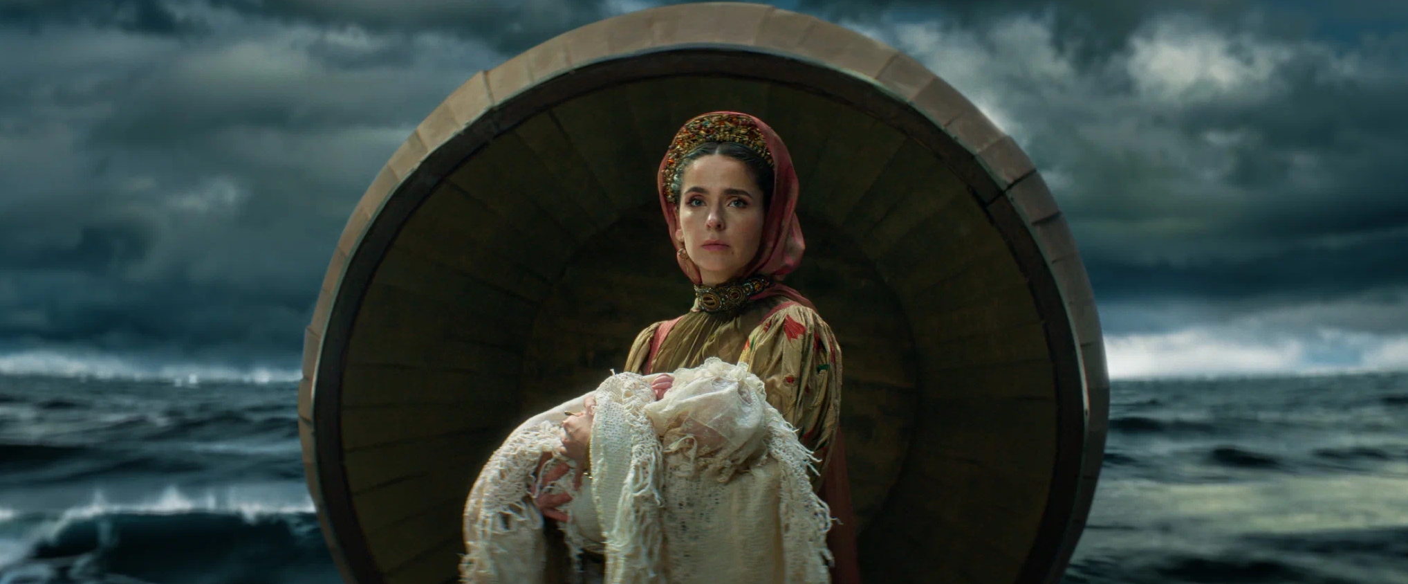 Бочку с героями прибивает к суше. Из нее выходит уже взрослый Гвидон в сапогах из змеиной кожи, с красивыми светлыми волосами… жаль, заметно, что они осветленные, с черными корнями. Не станем придираться к истории, потому что у Пушкина Гвидон тоже не рос, пока гонцы скакали туда-сюда. А вырос за сутки-двое уже в бочке.