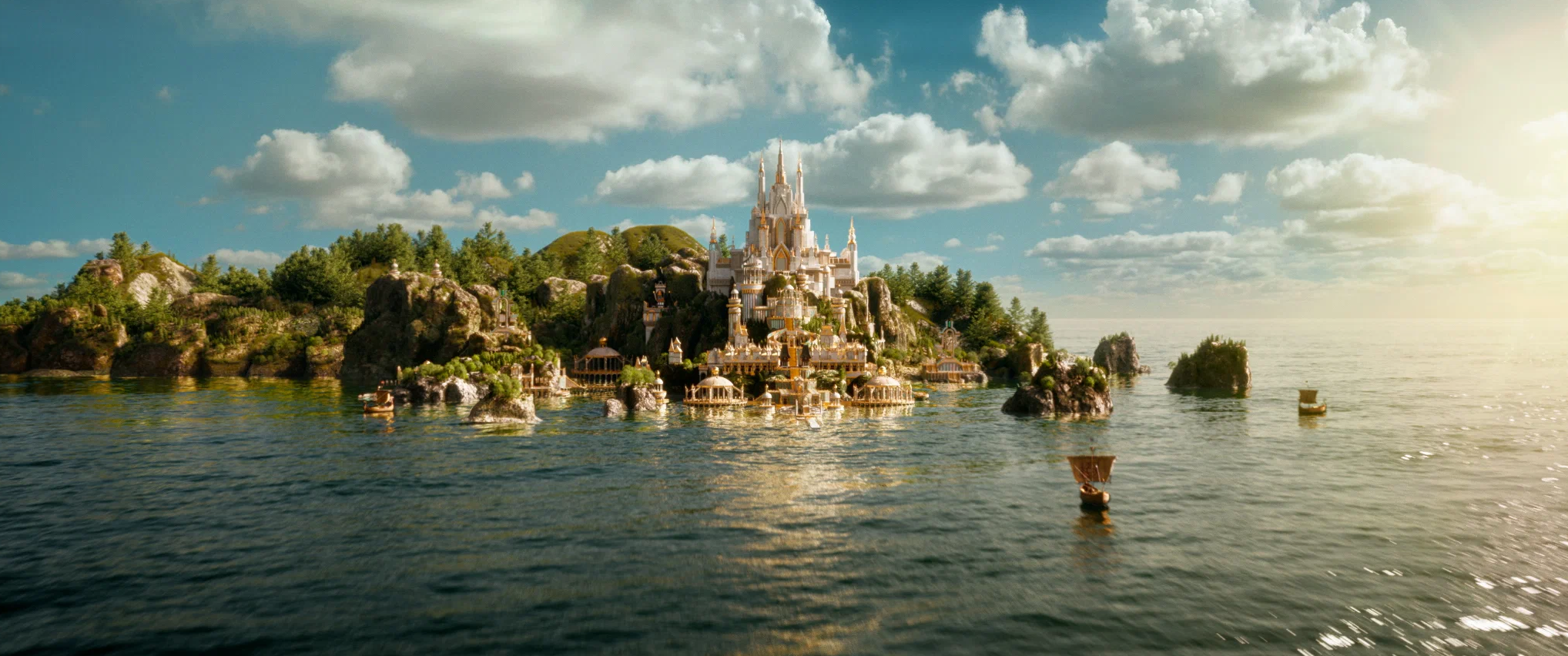 Да, новая «Сказка…» – это показное «дорого-богато», доведенное до абсурда. История ломится от обилия фальшивых драгоценностей, которые тут повсюду – от кокошников до одежды. Трон Салтана сделан из золота. От ярких цветов режет глаза. Все призвано показать, какие Салтан и Гвидон богатые – но истории это не помогает. Хотя авторы и проделали большую работу по созданию костюмов и декораций (например, город Гвидона занял около 3000 м²), выглядят они искусственно. Может даже появиться ощущение, что снимали актеров на фоне зеленого экрана, а не реальных декораций.